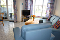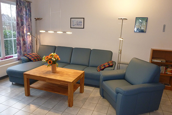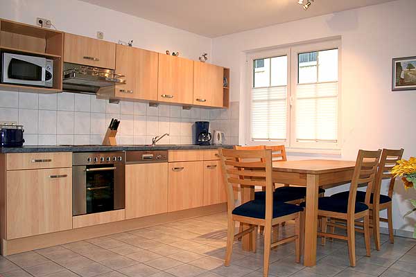 Wohnraum mit Küchenzeile, Herd mit Backofen, Geschirrspüler, Mikrowelle, SAT-TV,